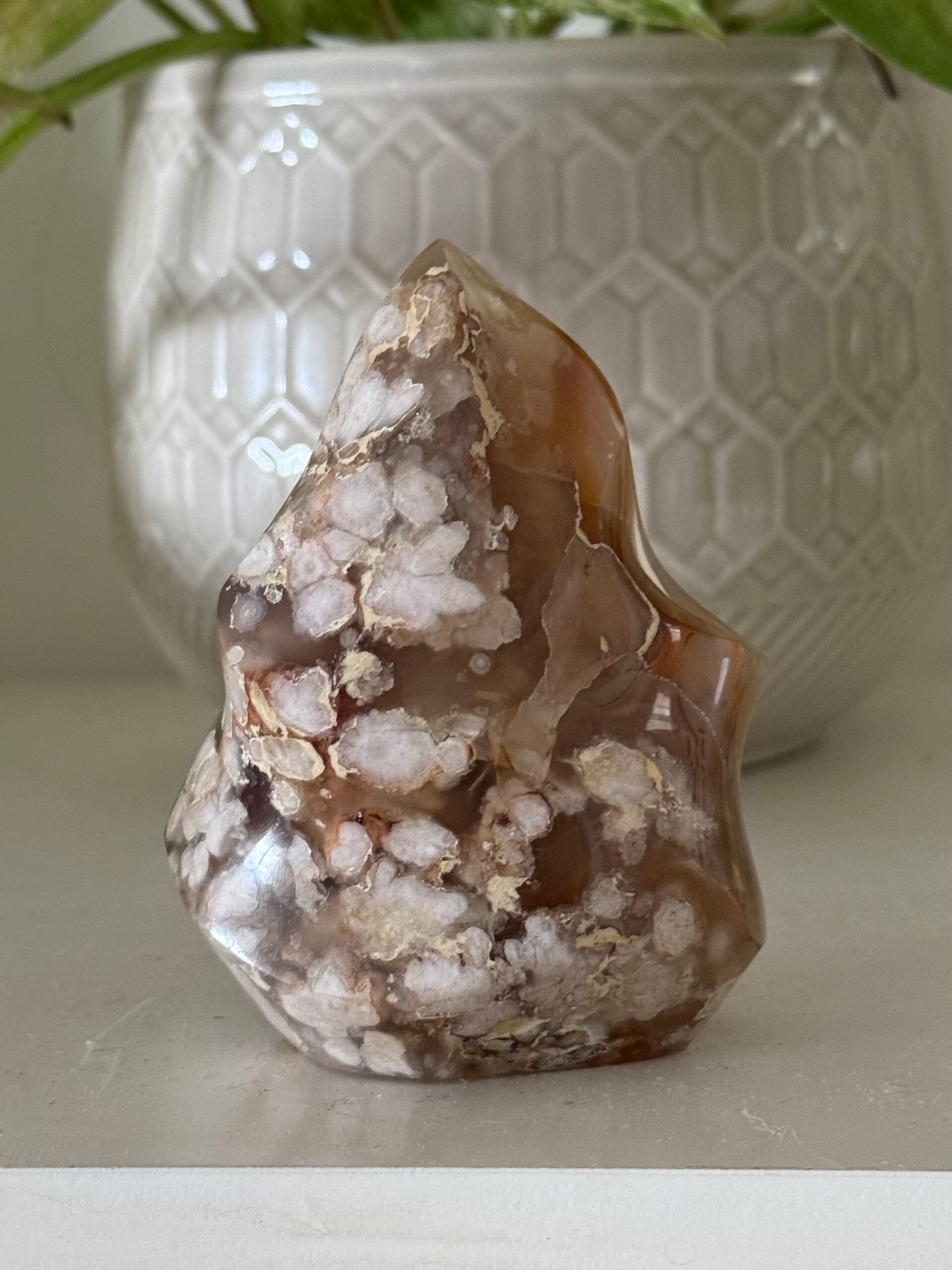 Flower agate's meaning is centered around growth, emotional healing, and personal development, symbolizing a journey from "seed to blossom". It is believed to encourage one to reach their full potential, bridging the gap between intentions and actions, and helping to release emotional blockages. This new crystal from Madagascar, with its beautiful floral-like inclusions, connects to both the Heart and Root chakras, grounding one while fostering emotional growth.