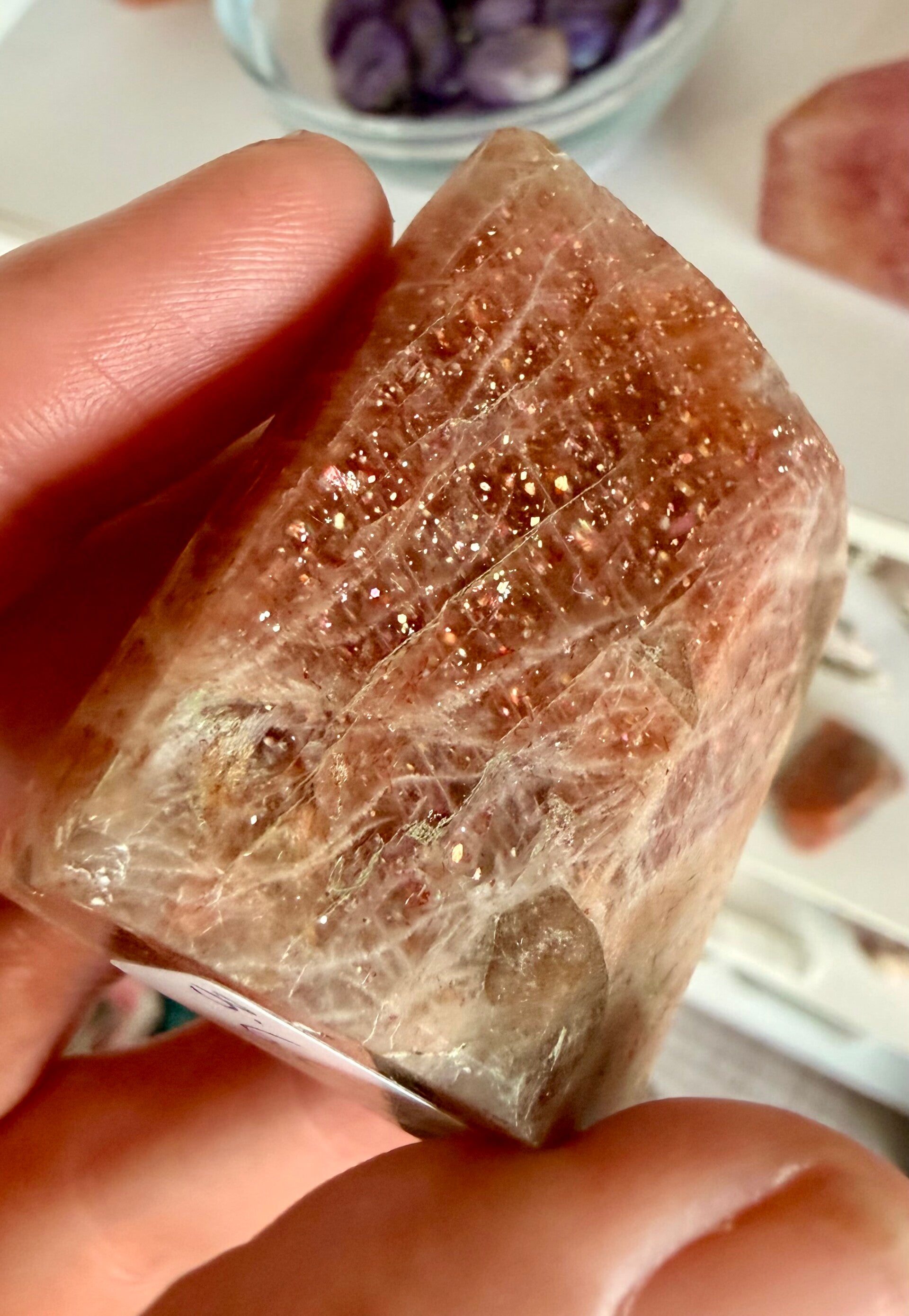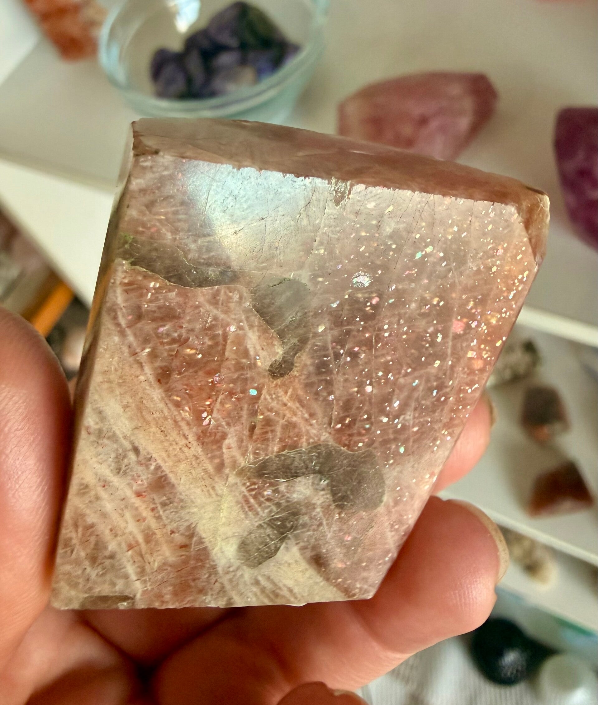 Rainbow Lattice Sunstone is a rare Australian feldspar (orthoclase) featuring a unique grid-like pattern of iridescent hematite and magnetite inclusions. It symbolizes joy, personal empowerment, and energy alignment, specifically balancing the heart, solar plexus, and sacral chakras. It is used for spiritual grounding, mental clarity, and removing negativity