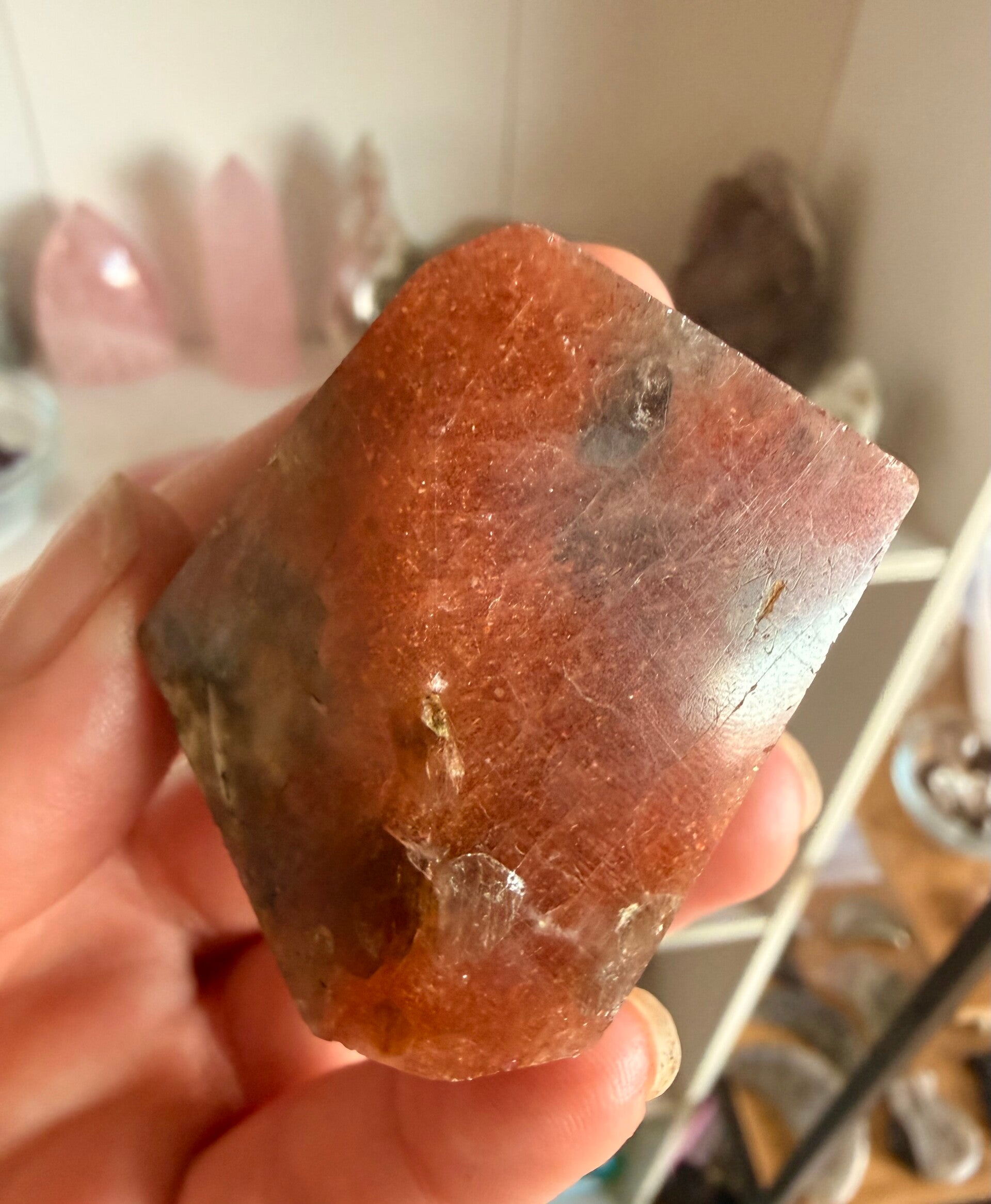 Rainbow Lattice Sunstone is a rare Australian feldspar (orthoclase) featuring a unique grid-like pattern of iridescent hematite and magnetite inclusions. It symbolizes joy, personal empowerment, and energy alignment, specifically balancing the heart, solar plexus, and sacral chakras. It is used for spiritual grounding, mental clarity, and removing negativity