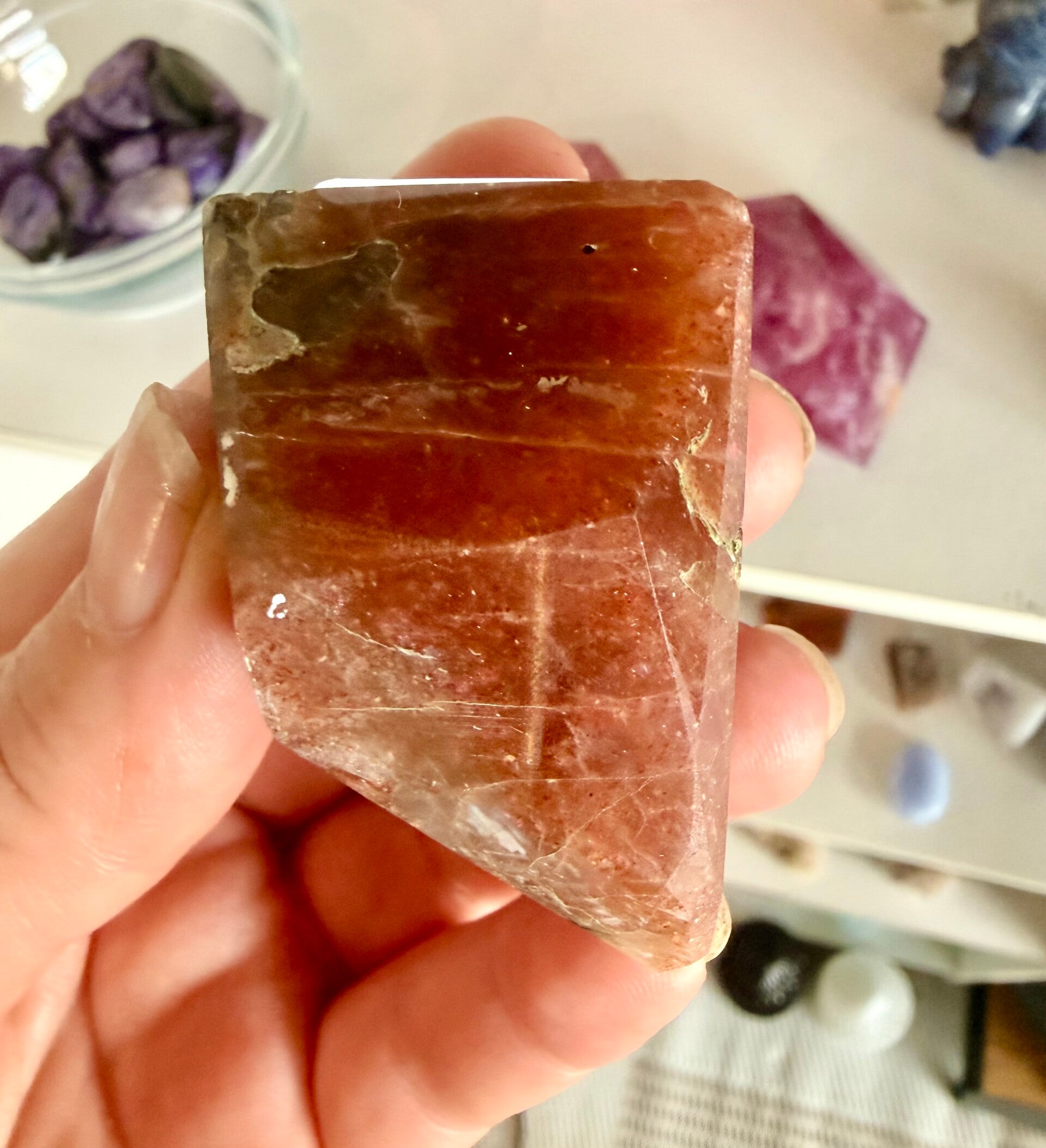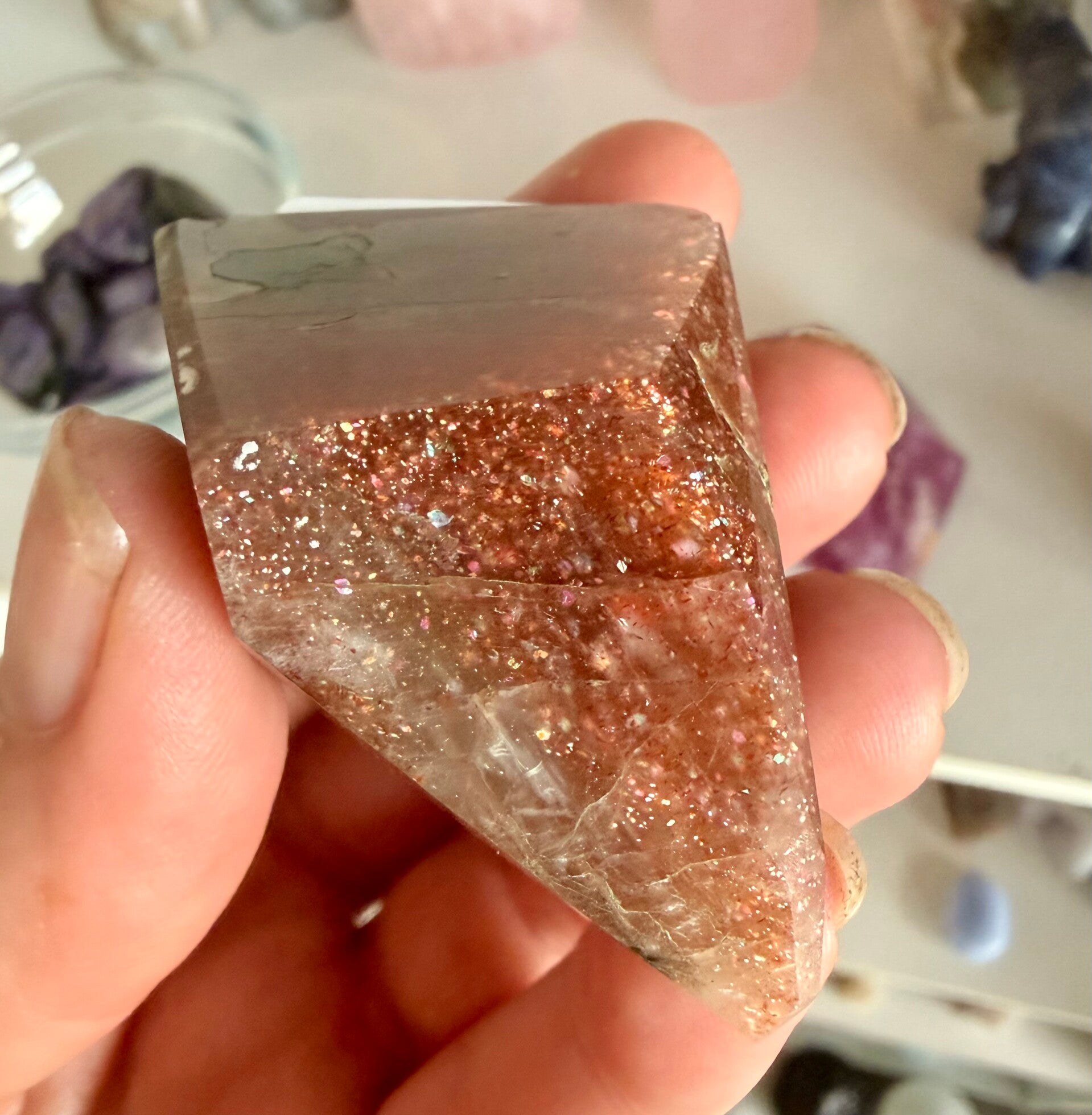 Rainbow Lattice Sunstone is a rare Australian feldspar (orthoclase) featuring a unique grid-like pattern of iridescent hematite and magnetite inclusions. It symbolizes joy, personal empowerment, and energy alignment, specifically balancing the heart, solar plexus, and sacral chakras. It is used for spiritual grounding, mental clarity, and removing negativity