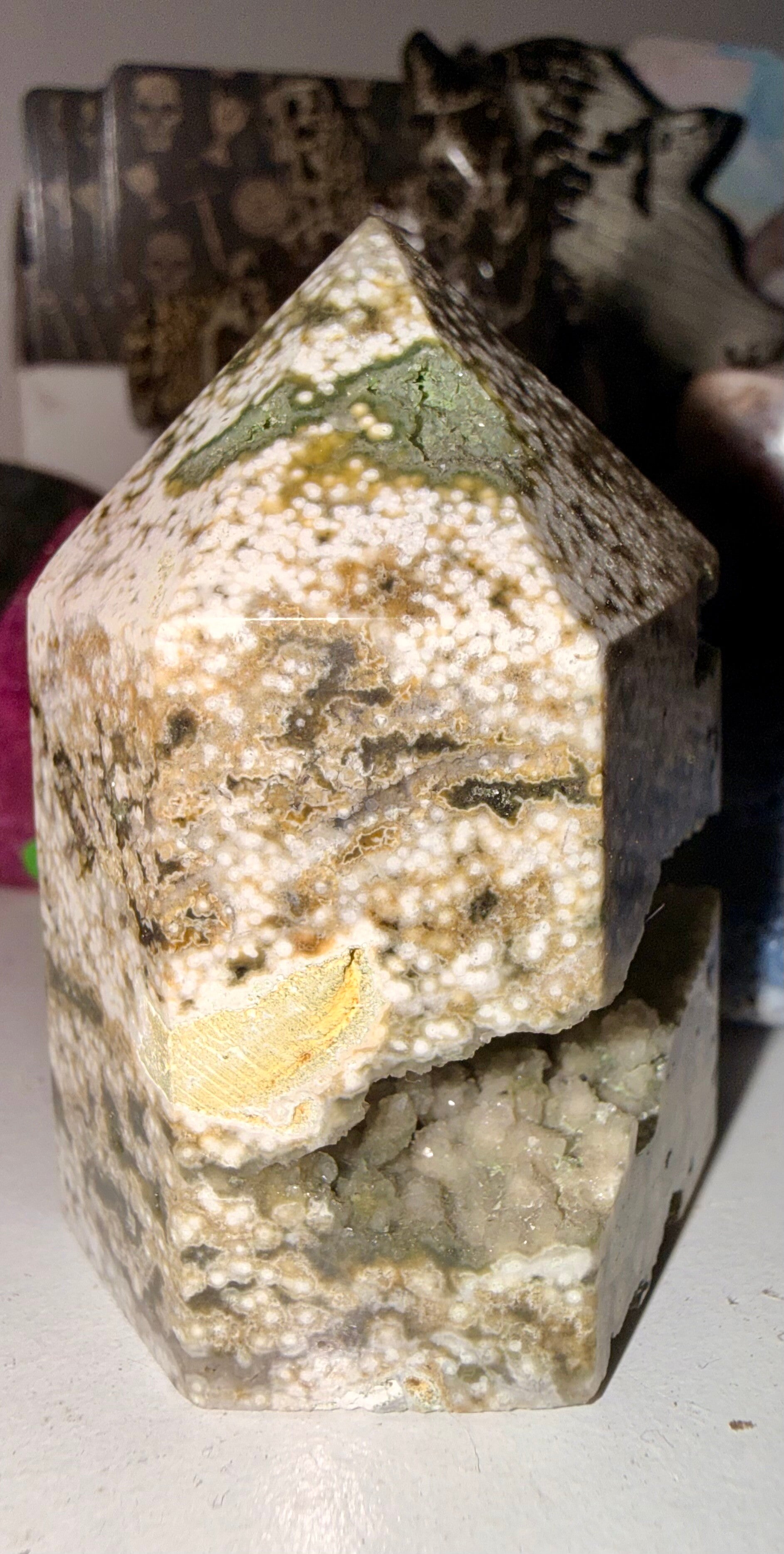 Ocean Jasper is a, soothing, and protective stone known as the "Atlantis Stone" or "Stone of Joy," believed to foster emotional healing, optimism, and stress relief. It helps release negative emotions and aids in going with the flow of life's cycles, aligning the solar plexus, heart, and throat chakras