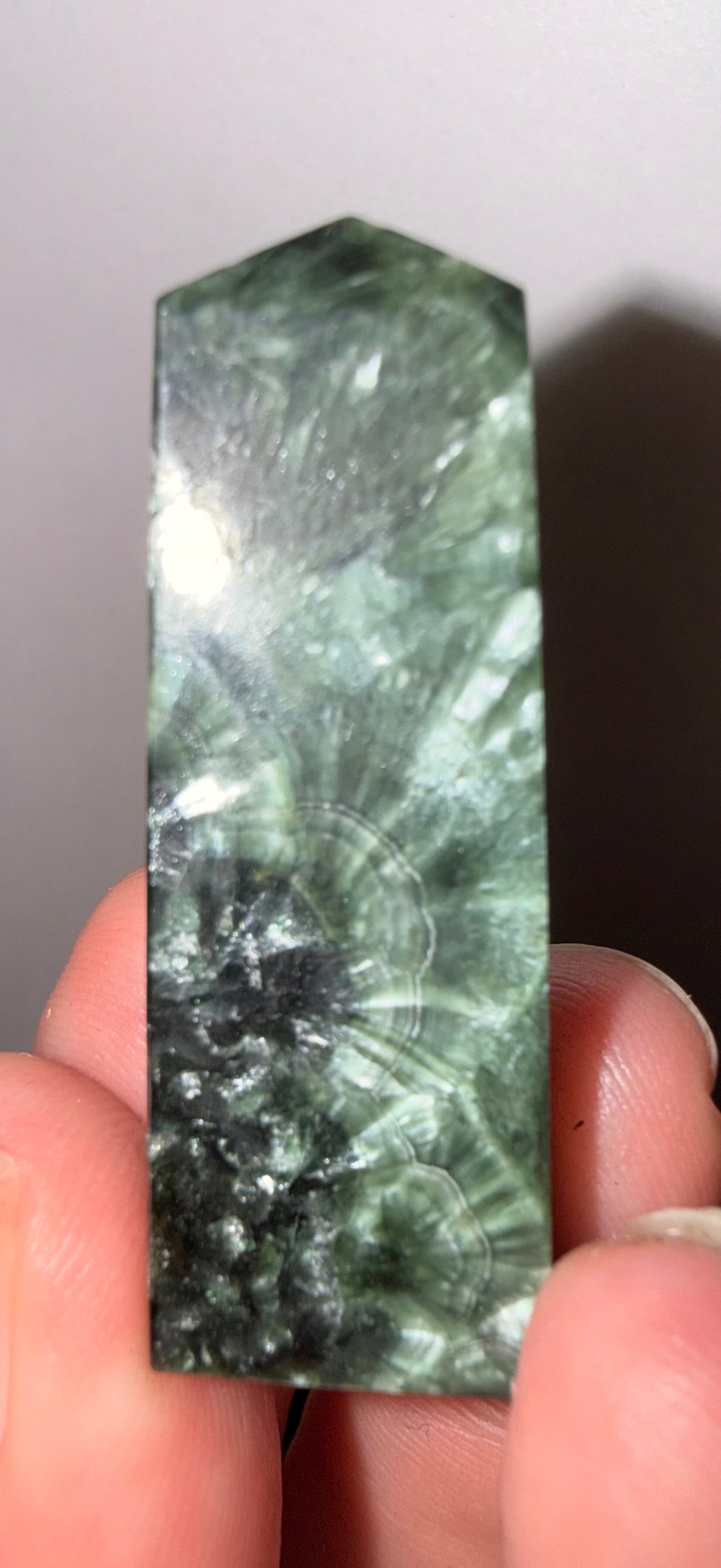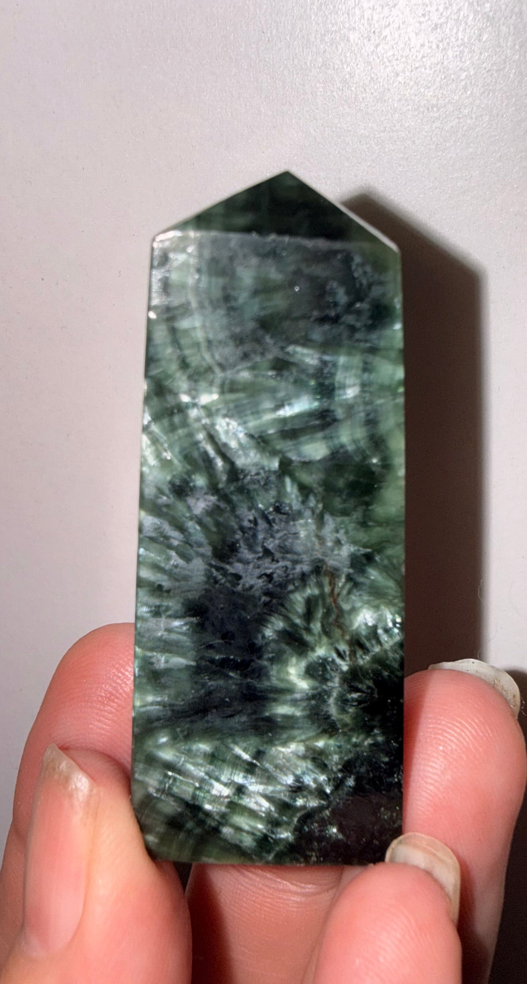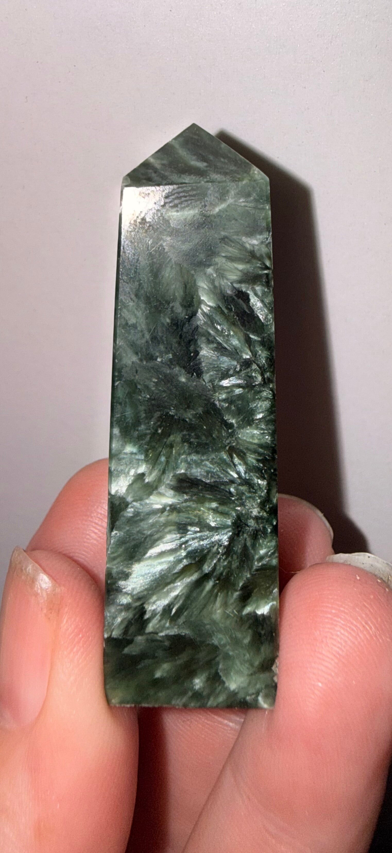 Seraphinite is a rare, deep-green chlorite mineral from Siberia known as the "Angel Stone" due to its silver, feather-like, chatoyant inclusions resembling wings. It is primarily used to connect with angelic realms, promote spiritual ascension, and open the heart chakra. Synonyms include Clinochlore, Green Chlorite, and sometimes the Angel Stone.