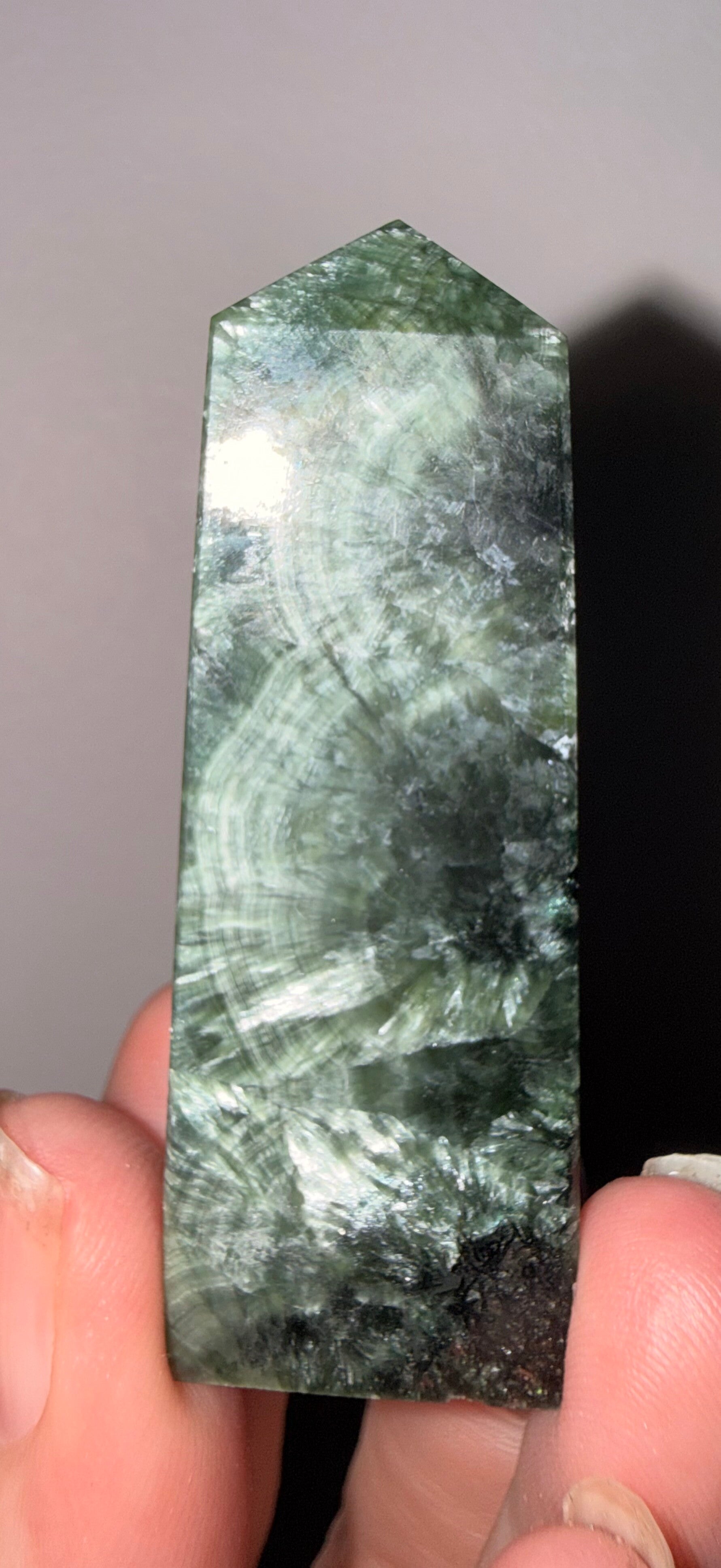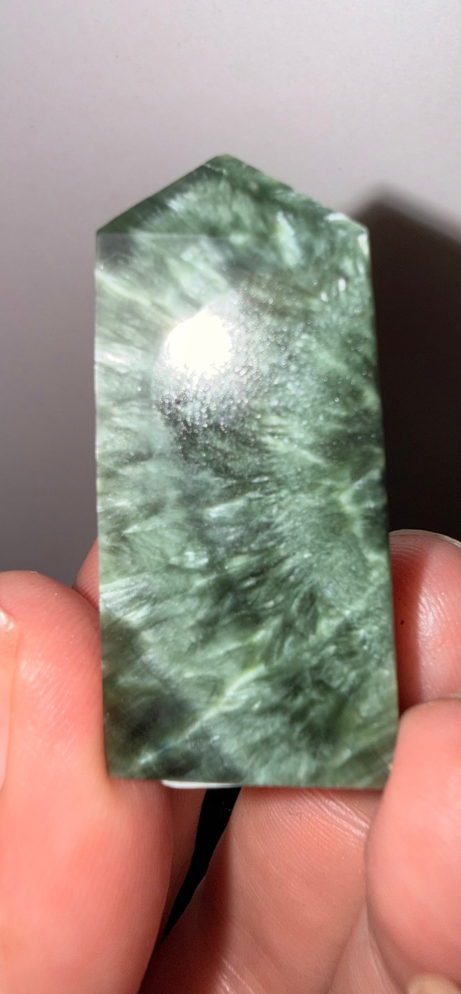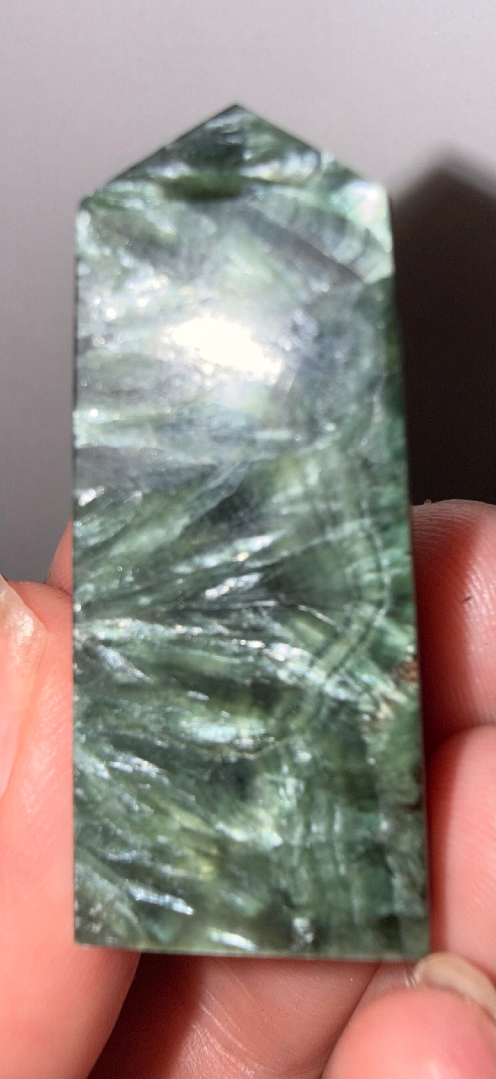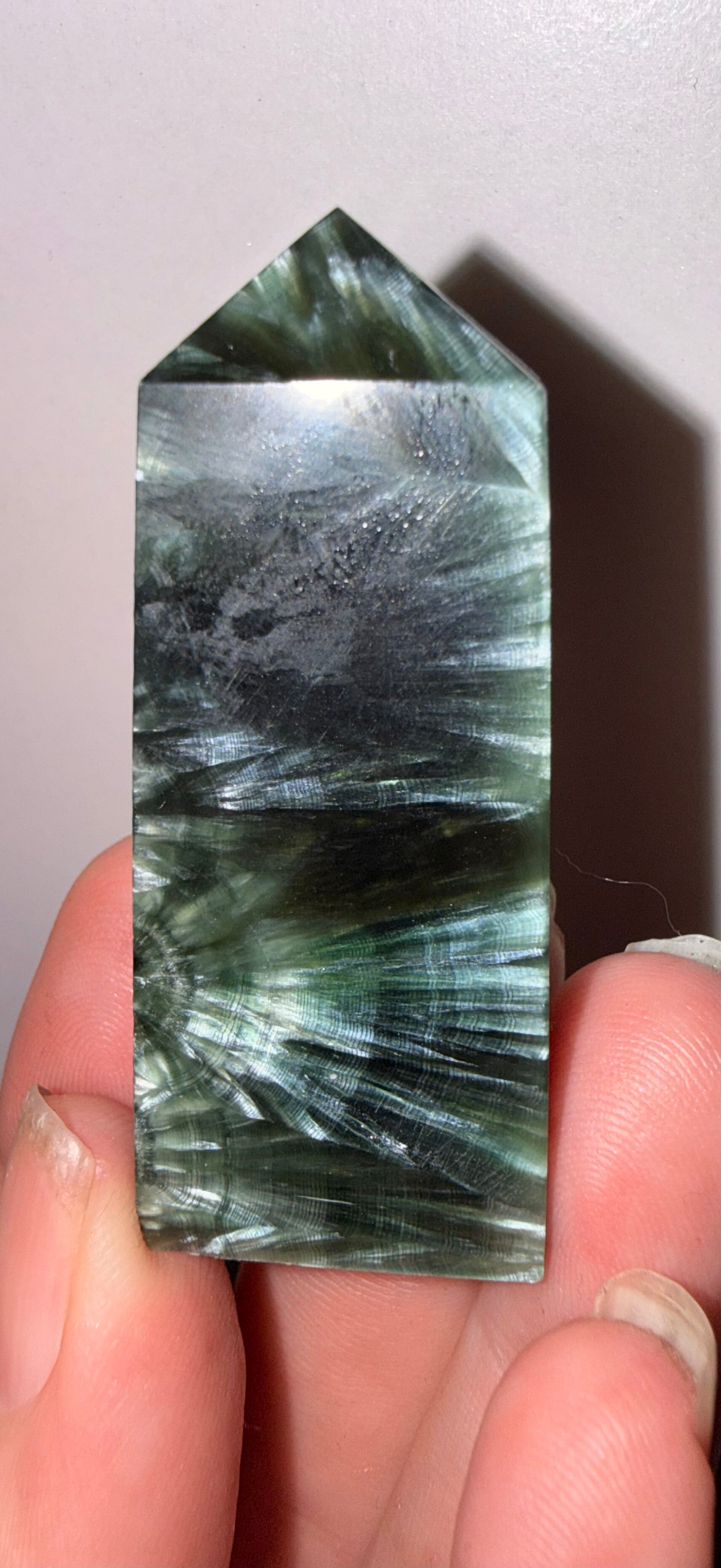 Seraphinite is a rare, deep-green chlorite mineral from Siberia known as the "Angel Stone" due to its silver, feather-like, chatoyant inclusions resembling wings. It is primarily used to connect with angelic realms, promote spiritual ascension, and open the heart chakra. Synonyms include Clinochlore, Green Chlorite, and sometimes the Angel Stone.