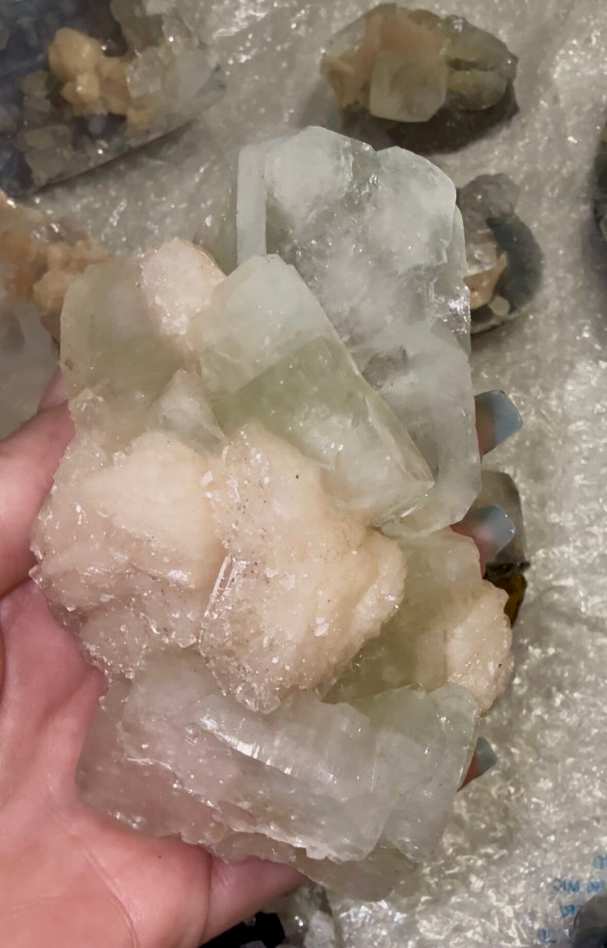 Apophyllite and Stilbite often grow together, creating a powerful combination for spiritual and emotional healing. Apophyllite (meaning "it flakes off" in Greek) is a high-vibration stone for mental clarity, reducing stress, and connecting to higher realms. Stilbite (meaning "to shine") offers a gentle, loving energy that opens the heart chakra, aids in calm sleep, and helps manifest dreams.